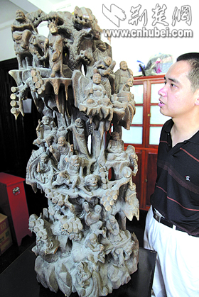 記者看到,這件樟木雕的十八羅漢高約1米,神態(tài)各異,栩栩如生。據(jù)介紹,羅漢是清代雕刻的,屬國家三級文物。