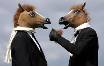 英國埃普瑟姆德比賽馬會(huì)是歐洲最豪華排場(chǎng)的賽馬大會(huì),為期兩天。圖為觀眾戴著馬頭交談。
