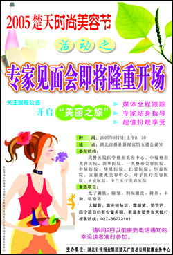 荊楚網(wǎng)消息(楚天金報)2005楚天時尚美容節(jié)今起正式啟動,本集團將聯(lián)合武漢各大時尚美容機構(gòu),為愛美時尚人士提供各項時尚美容“大餐”。