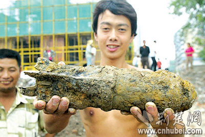 民工王先生說(shuō),他們挖坑時(shí),鐵鍬突然碰到一個(gè)硬東西,扒出一看,竟然是個(gè)“啞”炮。隨后,他們又在旁邊挖出一些人的尸骨。