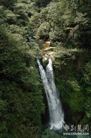 參觀完兩處紅色旅游景點(diǎn)之后,記者們順道觀光了龍?zhí)讹L(fēng)景區(qū)。龍?zhí)段挥诖钠何鞅逼吖铮墙陙黹_發(fā)的以自然與人文景觀相結(jié)合的旅游風(fēng)景區(qū)。據(jù)介紹,當(dāng)?shù)氐奈迳窈邮驱執(zhí)丁拔逄妒似佟钡脑慈。溪水沖擊小井峽谷后,陡然跌落絕壁之下,又連續(xù)飛下四級斷崖,形成梯狀的五個(gè)氣勢磅礴的瀑布和深潭,這就是碧玉、金鎖、珍珠、飛鳳、玉女等五潭五瀑。細(xì)察五潭,碧水泱泱,樹影幢幢,崖壁如刀削斧鑿,崖腳怪石,汀芷競秀,綠蔭覆蓋四周。仰觀五瀑,潭潭無俗水,瀑瀑似神女。