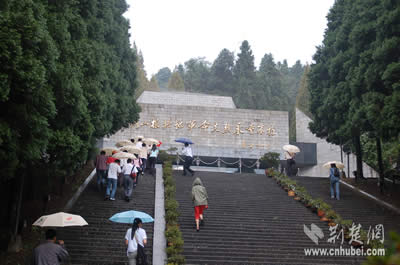 進(jìn)門后,展現(xiàn)在人們眼前的是109級臺(tái)階,威嚴(yán)肅穆的紀(jì)念堂就矗立在山頂上。導(dǎo)游小姐告訴記者,這些臺(tái)階分為兩組,第一組49級,象征1949年新中國成立。第二組60級,寓意陵園是在井岡山革命根據(jù)地創(chuàng)建六十周年的1987年建成。