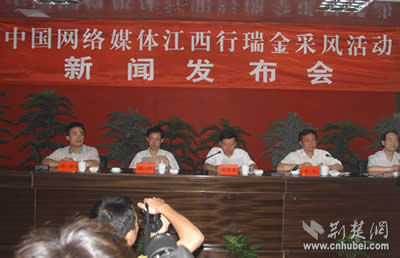 荊楚網(wǎng)消息 記者姚啟慧報(bào)道:12日晚,第二屆中國(guó)網(wǎng)絡(luò)媒體江西行采訪團(tuán)抵達(dá)共和國(guó)搖籃瑞金。13日上午,瑞金市舉行隆重的記者招待會(huì),瑞金市委書(shū)記肖毅親自向采訪團(tuán)記者推介紅色故都瑞金,市長(zhǎng)楊中茂主持會(huì)議。