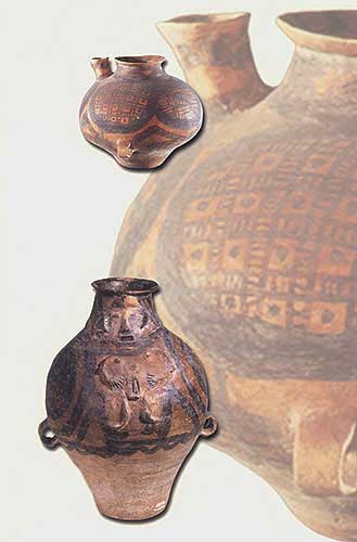 彩陶人像陶壺:水器(下,高34厘米)[相關(guān)鏈接]:20世紀(jì)中國(guó)百項(xiàng)考古大發(fā)現(xiàn)(1-20)21、大溪遺址(圖)22、城頭山遺址(圖)23、屈家?guī)X遺址(圖)24、崧澤遺址(圖)25、馬家窯遺址(圖)26、柳灣墓地(圖)27、牛河梁遺址(圖)28、城子崖遺址(圖)29、良渚文化遺址群(圖)30、石家河遺址群(圖)31、陶寺遺址(圖) 32、王城崗遺址(圖)33、齊家坪遺址(圖)34、卡若遺址(圖)35、石峽遺址(圖) 36、東灣仔北遺址(圖)37、圓山遺址(圖)38、二里頭遺址(圖)39、東下馮遺址(圖)40、夏家店遺址(圖)