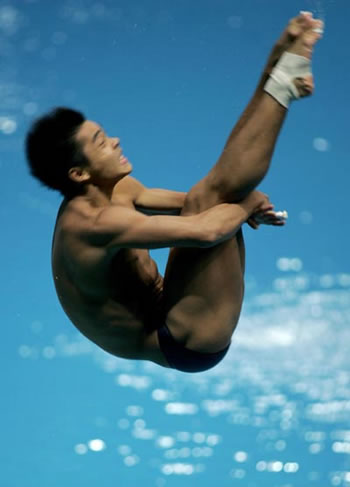 2005年10月5日,十運會跳水決賽最后一天的比賽在南京奧體中心落幕。在男子單人1米板的決賽中,預(yù)賽中排名第一位的廣東新秀何沖一掃在3米板比賽中沖金失利的陰影,憑借最后兩跳近乎完美的表現(xiàn)以總成績500.01分獲得冠軍。上海老將王天凌則以490.32分獲得銀牌,另外一名廣東選手羅玉通以466.53分摘得銅牌。解放軍名將彭勃和代表山東參賽的衛(wèi)冕冠軍王峰則因為在比賽中出現(xiàn)重大失誤,分別以447.12分和435.66分名列第五和第八位。圖為何沖在比賽中。(中體在線圖片 李錦河 攝)