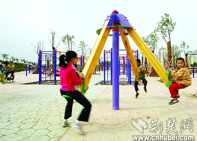 荊楚網(wǎng)(楚天都市報)(記者潘勤 朱熙勇攝)旋轉(zhuǎn)的飛輪、高蕩的秋千——日前,記者在漢口江灘三期工地看到:這里剛剛建起的大型群眾健身園里,已有孩子先玩為快了。