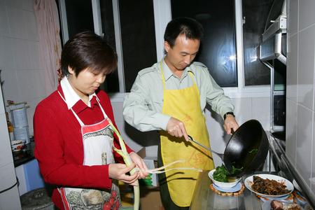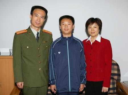 航天員費(fèi)俊龍和愛人王潔、兒子費(fèi)迪在家中合影
