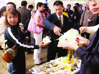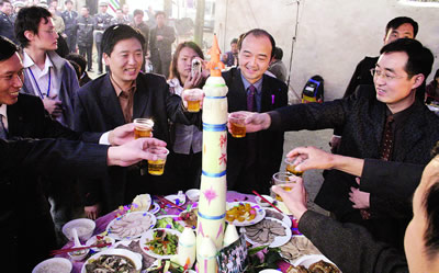 工作人員忙碌地張羅著。記者還發(fā)現(xiàn),在聶家新房前,新壘起了一個大磚灶,上面架一口大鐵鍋,鍋內(nèi)熱氣騰騰。經(jīng)打聽得知,因擔心前來道賀的親友眾多,工作人員特意向當?shù)貜N師借來一口大鍋,用于煮長壽面。因鍋實在是太大,聶家沒有相應(yīng)的灶能架住,于是人們在前日傍晚時分,臨時壘了這座灶臺。慶祝儀式結(jié)束后,記者上前打聽一共向這口大鍋里下了多少面條。兩名幫忙的鄉(xiāng)親說:“我們不停地在下面條,已經(jīng)記不清到底下了多少了!”他們還告訴記者,在當?shù)兀昭缛绱寺≈,天南海北的人如此眾多,如此受到關(guān)注,在楊垱鎮(zhèn)甚至在整個襄樊市“都應(yīng)該是第一次”。
