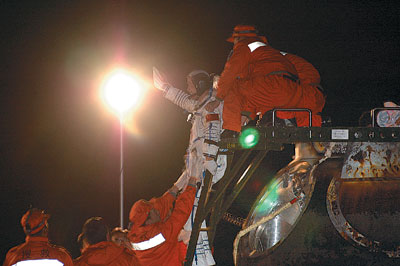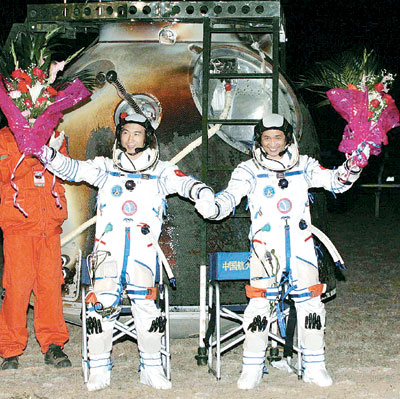 轉(zhuǎn)眼之間,艙門已被打開。費俊龍、聶海勝向人們揮動著手臂,輕快出艙。細心的工作人員,已經(jīng)在艙門外為他們擺好了兩把椅子。