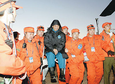 5分鐘后,兩名航天員在工作人員的簇擁下,進入著陸點100米開外的一架直升機內(nèi)全面體檢,工作人員和群眾在外焦急地等待最后的檢查結(jié)果。