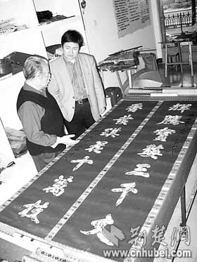 荊楚網(wǎng)消息(楚天都市報(bào))(記者何君輝)昨日,收藏者王先生在漢繡傳人任本榮家中,展示了自己珍藏的一幅刺繡對聯(lián)。對聯(lián)長2.4米,以花朵圖案拼接出“輝騰寶婺三千丈香發(fā)琪花十萬枝”字樣。王先生說,自己十多年前在地?cái)偵匣?00元購得這件繡品,一直沒有機(jī)會(huì)為它“驗(yàn)明正身”