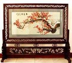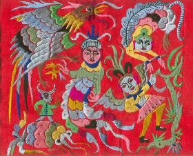 苗繡 刺繡,是苗族婦女盛裝不可或缺的飾物,主要有領花、肩花、襟花、背塊花、袖口花、裙鑲花、帽頂花、帽頂花等品種。苗族刺繡,整體上多為幾何構圖,古樸多姿。其圖案因繡片條、塊的不同,分為幾何二方連續(xù)式和四方連續(xù)式構圖。其圖案取材于生活中常見的草木、鳥獸、蟲魚、器具等。圖案的整體布局一般以菱形為立體紋樣,常見的是大菱形中套小菱形,小菱形又分別由不同色彩的方、圓、三角點狀組成。條狀繡片,多用點、線或線面組合,一整二剖構圖。繡片是按布的經(jīng)緯戳針,故曲線多折角。大塊繡片,如背塊花等,多用菱形四方連續(xù)構圖,并在其中布以對稱的變形幾何點及其他折線。所有繡片,粗看五彩斑斕,細觀則不同色線組圖分明,交錯重疊,既復雜多變又結構嚴謹、條理清晰。繡法很多,有平繡、凸繡、辮繡、堆花、縐繡、纏繡、挑繡、抽花等。平繡是最曾遍的繡法。這種繡法是重于圖案布局的美觀勻稱,色調(diào)鮮明,有明顯的物象感。凸繡流行于凱里、臺江部分地區(qū),它是在底布上多鋪幾層紙花,使所繡圖案凸出,有立體感。辮繡只在雷公山巴拉河一帶流行,其方法是將若干根色線編成辮子,按設計圖案平鋪于底布上,用絲線釘牢即成。圖案色調(diào)大致是青年女子鮮艷,中年以上婦女稍渾暗。如凱里、黃平、施秉等地,姑娘及較年輕婦女的盛裝刺繡以青布作底,繡大紅,間有少量白黃綠之色,亮麗醒目;中年以上婦女盛裝刺繡,亦以青布作底,以紫藍為基調(diào),間以少許桔紅、綠、白等色,顯得深沉穩(wěn)重。 京繡 京繡又稱宮繡,明清時期開始大為興盛,多用于宮廷裝飾、服飾,用料講究、技術精湛、格調(diào)風雅,民間高檔的宮繡大都與皇宮有著千絲萬縷的聯(lián)系。京繡屬手工刺繡,所以在今天機繡發(fā)達的時候,為區(qū)別于機繡又名“手繡”。京繡在解放后,逐漸形成了自己鮮明的藝術特點與風格,其選料精當貴重,針工巧妙得體,色彩絢麗豪華,格調(diào)高雅。其中最好為針工中的“平金打籽”繡。這種繡,是以真金捻線盤成圖案,或結籽于其上,十分精致,華貴。 發(fā)繡 發(fā)繡,又稱“墨繡”。是以人的頭發(fā)為材料,在綢緞、絲絹或滌綸布上精心繡制的特種藝術品。具有淡雅、不褪色、耐腐蝕、利于收藏等特點。彩色發(fā)繡是相對于單色發(fā)繡而言,它是指以不同人種的天然色澤發(fā)絲為材料,遵循色彩規(guī)律,在繃平整的布帛上施針度線,塑造形象的藝術。作品的質(zhì)感效果特別好, 畫面有微妙的色彩變化,層次較單色發(fā)繡豐富,技巧靈活多變,形象更加栩栩如生。 材料的特質(zhì)屬性賦予發(fā)繡藝術獨特的魅力,具有豐富的人文內(nèi)涵,如用自己的頭發(fā)繡一幅寫真“二我”,具有生命的直接紀念意義。作品集繪畫與刺繡為一體,具有一定的美學價值和經(jīng)濟價值,又能經(jīng)久保存,千年不變,可謂收藏極品。 甌繡 由于溫州地處甌江之濱,故得名“甌繡”。400多年以前,浙江溫州地區(qū)已運用刺繡美化服飾, 繡品技藝也達到相當水平。據(jù)說甌繡最早產(chǎn)生于民間婦女之手,那時的刺繡品種有衣服、小兒帽 圈、圍涎、錦肚、婦女鞋面、枕頭、荷包等。題材只有花鳥魚蟲之類。甌繡真正成為供欣賞的藝 術品只有60多年歷史。1922年前后,溫州刺繡藝人林森友在上海一家刺繡莊發(fā)現(xiàn)了湘繡畫片, 回來后開辦了“美艷”刺繡作坊,仿照湘繡畫片的技法,改進甌繡生產(chǎn)。從此,溫州出現(xiàn)了甌繡畫片。