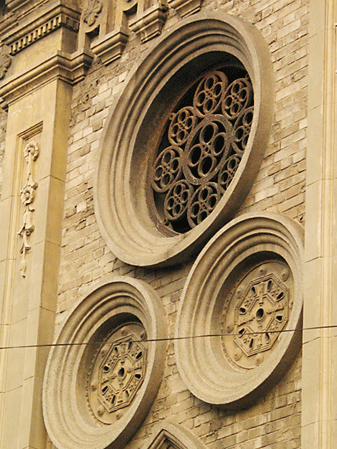 ③窗戶“合十”、“天圓地方”:古德寺窗戶的設(shè)計(jì)可謂別具一格。寶殿墻上可見(jiàn)三個(gè)一組的圓窗,分別為哥特風(fēng)格和中國(guó)的八卦圖;圓窗下是形如竹筍的花窗,象征著佛祖雙手合十的姿態(tài);回廊里的窗戶則上圓下方,取“天圓地方”之意。