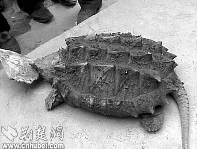 荊楚網(wǎng)消息(湖北日?qǐng)?bào))通訊員唐科達(dá)報(bào)道:22日,京山縣雁門(mén)口鎮(zhèn)阮溝村村民魏作華在清理魚(yú)塘?xí)r驚奇發(fā)現(xiàn)一只上面長(zhǎng)滿犄角的大鱉。這只大鱉牙齒鋒利,呈灰綠色,體重8.4公斤。