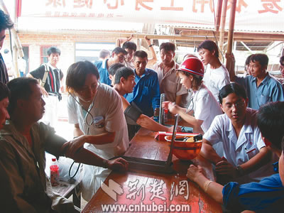 15日,參加武鋼工程建設(shè)的百余位農(nóng)民工兄弟,樂呵呵地接受了中國一冶電裝公司武鋼項目部為他們免費進行的體檢。浠水工程隊民工朱宗杰說:“這兩年來,社會各界對農(nóng)民工的關(guān)心很實在。”
