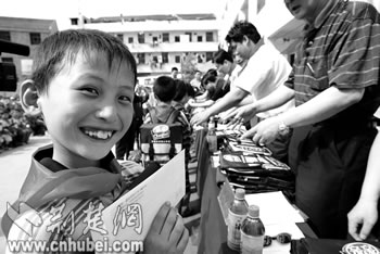 我省2005年春季“希望工程助學(xué)進(jìn)城計(jì)劃———金龍魚農(nóng)民工子女助學(xué)金”本月起開始陸續(xù)發(fā)放,1000余名在漢打工的農(nóng)民工子女可獲得每學(xué)期300元的資助款。預(yù)計(jì)五年內(nèi),我省將有4000人次的農(nóng)民工子女獲此項(xiàng)資助。圖為武漢市東升學(xué)校二年級的李灣小朋友領(lǐng)到助學(xué)金后高興地笑了。