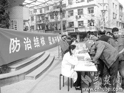 荊楚網(wǎng)(楚天都市報)(記者 盧水平 通訊員 夏瓊 項征國 攝)昨日是世界防治結(jié)核病日,江漢區(qū)疾控中心為附近幾個建筑工地的280名農(nóng)民工,進行免費結(jié)核病透視篩查,結(jié)果發(fā)現(xiàn)5例可疑肺結(jié)核病人。據(jù)介紹,進城務工者及流動人口肺結(jié)核病患病率,高出市內(nèi)常住人口一倍,是目前城市結(jié)核病的重要傳染源。