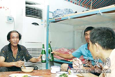 記者走進一間宿舍,頓時感受到了空調(diào)吹出的絲絲涼氣,顯示溫度為26℃。工人們正在喝啤酒吃晚餐,因為涼快,沒有一個打赤膊的。大伙笑著說:往年一到夏天總為睡覺發(fā)愁,太熱了睡不好,白天做事自然沒精神,今年用上空調(diào)后,日夜心里都蠻爽。