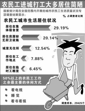 此外,農(nóng)民工生活質(zhì)量普遍不高。首先是農(nóng)民工生活、衛(wèi)生條件差。受工資水平低限制,大部分農(nóng)民工的月消費(fèi)幾乎全部用于住宿和食品消費(fèi),而在生病時,只有少數(shù)人會選擇去正規(guī)醫(yī)院,其他人大都選擇自己買藥治療或去個體診所。其次是居住環(huán)境質(zhì)量差。近40%的農(nóng)民工居住在工棚或集體宿舍里,地方狹窄擁擠,室內(nèi)骯臟零亂,除了被褥衣物,幾無他物。