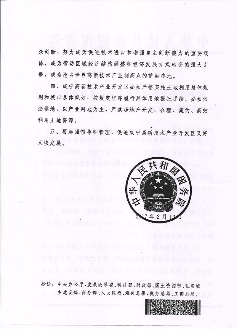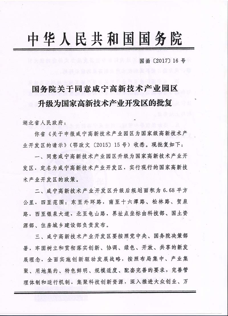 一、同意咸寧高新技術產(chǎn)業(yè)園區(qū)升級為國家高新技術產(chǎn)業(yè)開發(fā)區(qū),定名為咸寧高新技術產(chǎn)業(yè)開發(fā)區(qū),實行現(xiàn)行的國家高新技術產(chǎn)業(yè)開發(fā)區(qū)的政策。