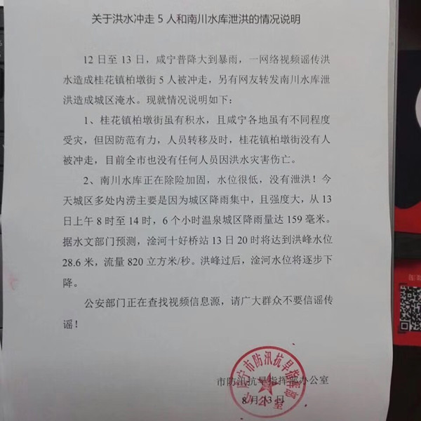 湖北日報網(wǎng)訊(通訊員敖瓊)12日至13日,咸寧普降大到暴雨,一網(wǎng)絡視頻謠傳洪水造成桂花鎮(zhèn)柏墩街5人被沖走,另有網(wǎng)友轉發(fā)南川水庫泄洪造成城區(qū)淹水。咸寧市防汛抗旱指揮部辦公室發(fā)布說明:這些均為不實信息!情況說明如下: