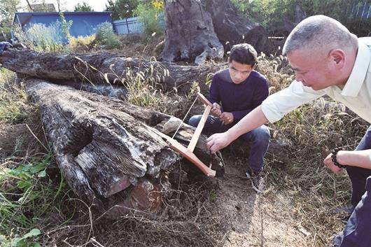 專家現(xiàn)場檢查木頭的橫切面