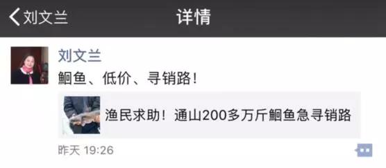 和丁小強一樣,中百超市副總經(jīng)理劉文蘭,也在朋友圈轉(zhuǎn)發(fā)了湖北日報的微信稿件,并配文:“鮰魚、低價、求銷路”,幫忙推廣。