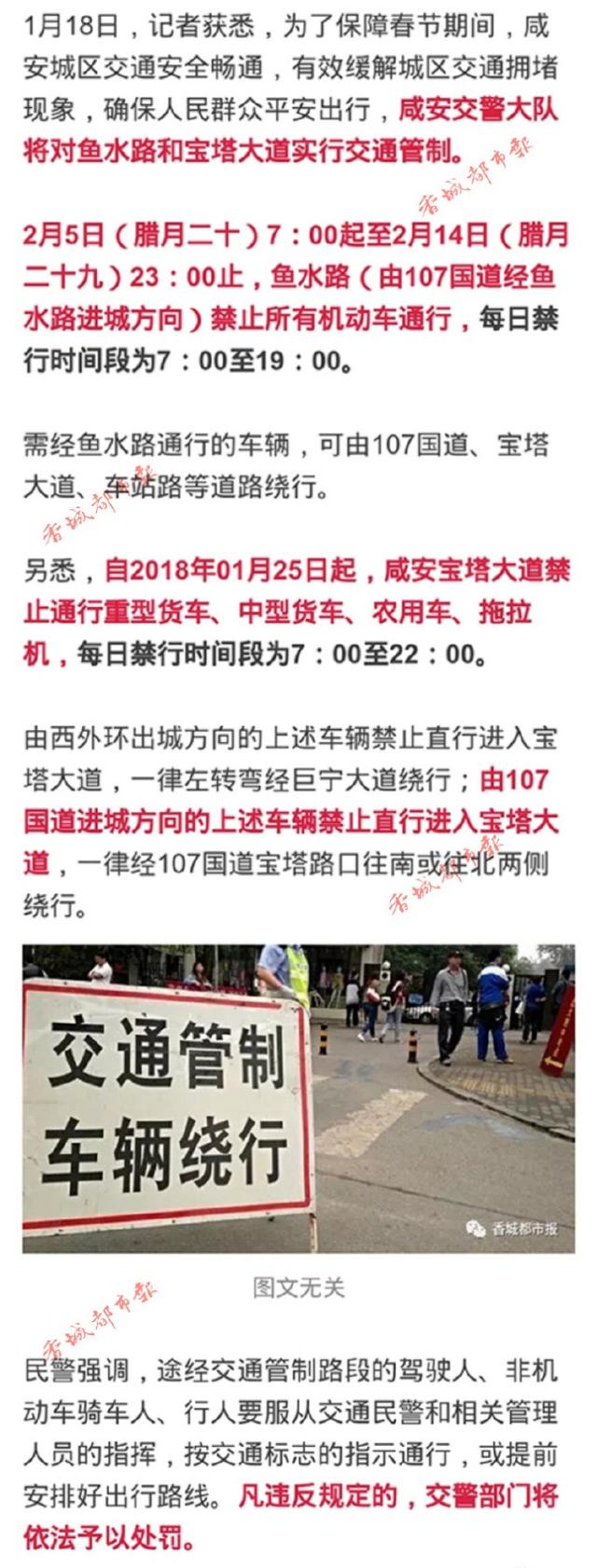 18日悉,為保障春節(jié)期間,咸安城區(qū)交通安全暢通,咸安交警大隊將對魚水路和寶塔大道實行交通管制。途經(jīng)交通管制路段的駕駛?cè)恕⑿腥艘慕煌窬拖嚓P管理人員的指揮,按交通標志的指示通行。凡違反規(guī)定的,將依法處罰。具體路段