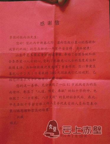 “尊敬的張向溫先生,您寄來(lái)的3000元捐款我們已經(jīng)收到,在此,平邑縣紅十字會(huì)全體工作人員并代表受助人員向您表示衷心地感謝和崇高的敬意……”這是山東省平邑縣紅十字會(huì)于2016年給張向溫寄的感謝信中的一段話(huà)。