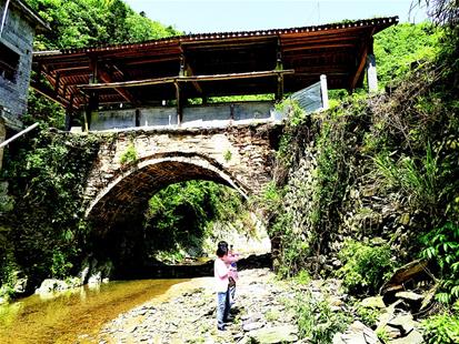 石城鎮(zhèn)文化站站長(zhǎng)龔益來介紹,2015年6月2日暴雨,石橋部分被沖毀。他聯(lián)系上從塔坳村走出去的加拿大籍華人汪十友,募資10萬元,加上鄉(xiāng)鄰捐助,花費(fèi)13萬余元于當(dāng)年9月重修。為整舊如舊,橋基上的壘石仍保留當(dāng)年瑤族先民的遺存,清光緒十四年的修橋記錄原樣保存在前面橫梁上,此次修橋記錄則刻在后面橫梁上。