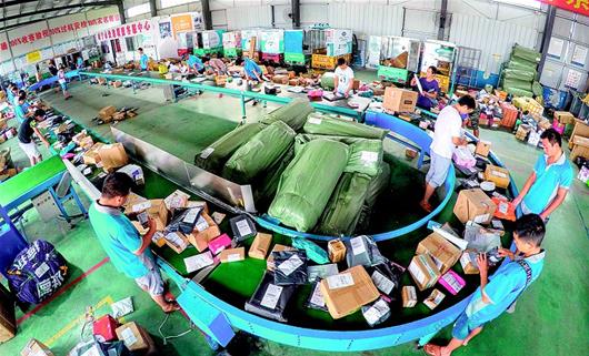 6月29日,赤壁市康華物流園快遞分撥中心,員工正在傳送帶上按區(qū)域分揀包裹。50余家物流、倉(cāng)儲(chǔ)企業(yè)入駐該園,每天約有2.8萬(wàn)件包裹進(jìn)出。赤壁市整合物流資源,實(shí)行統(tǒng)一收寄處理,快遞效率提高了,派件成本降低約20%,寄件成本降低50%以上。