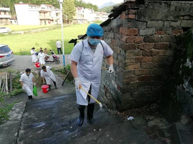 衛(wèi)生部門進村灣對農(nóng)戶房前屋后進行消殺,凈化環(huán)境。(胡劍芳攝)