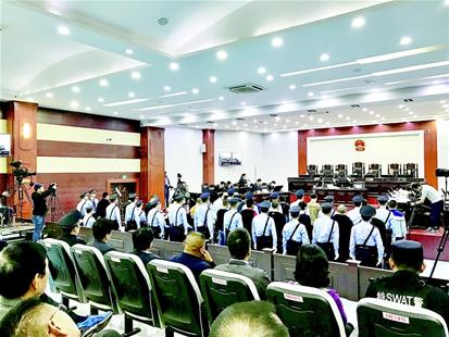 前日上午,庭審開始,23名涉黑團(tuán)伙成員集體站在被告席上,出于部分被告身體不適,審判長讓被告人坐下聽庭。