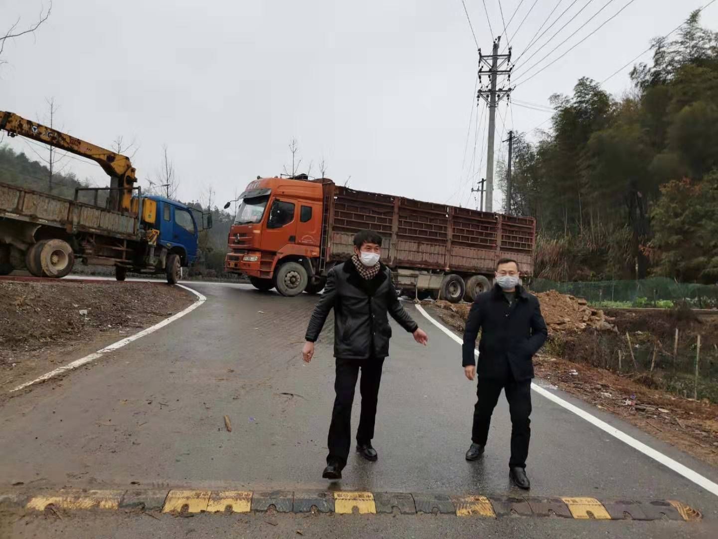 赤壁市官塘驛鎮(zhèn)隨陽大竹山村,可以看到各色大卡車橫在各路中央,還有醫(yī)務人員守候在側(cè)。