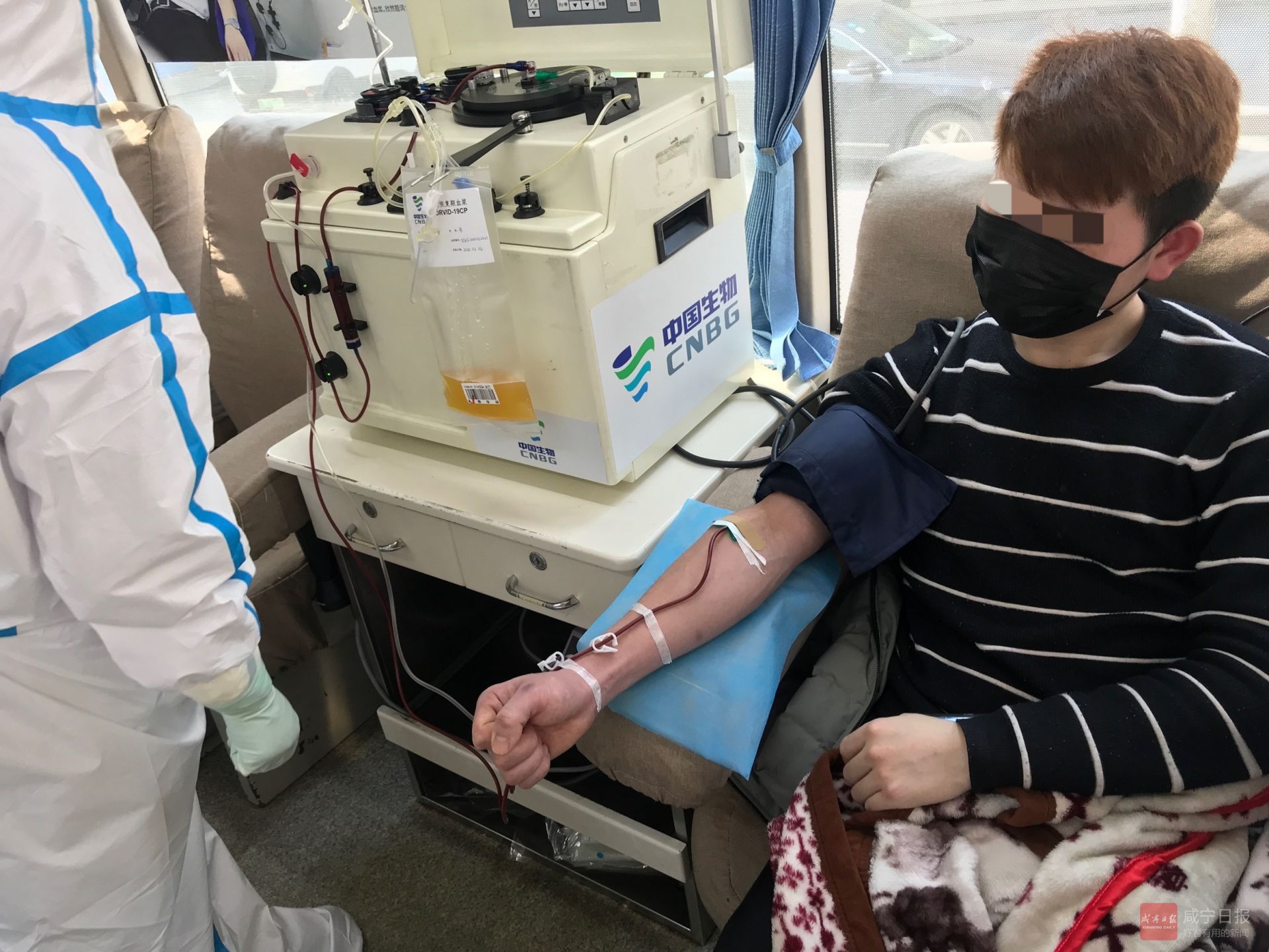 當(dāng)天,治愈患者程某在經(jīng)過(guò)CT、核酸檢測(cè)、體檢征詢(xún)等一系列操作后,在咸寧市中心血站流動(dòng)采血車(chē)上接受了血漿采集,共400毫升。