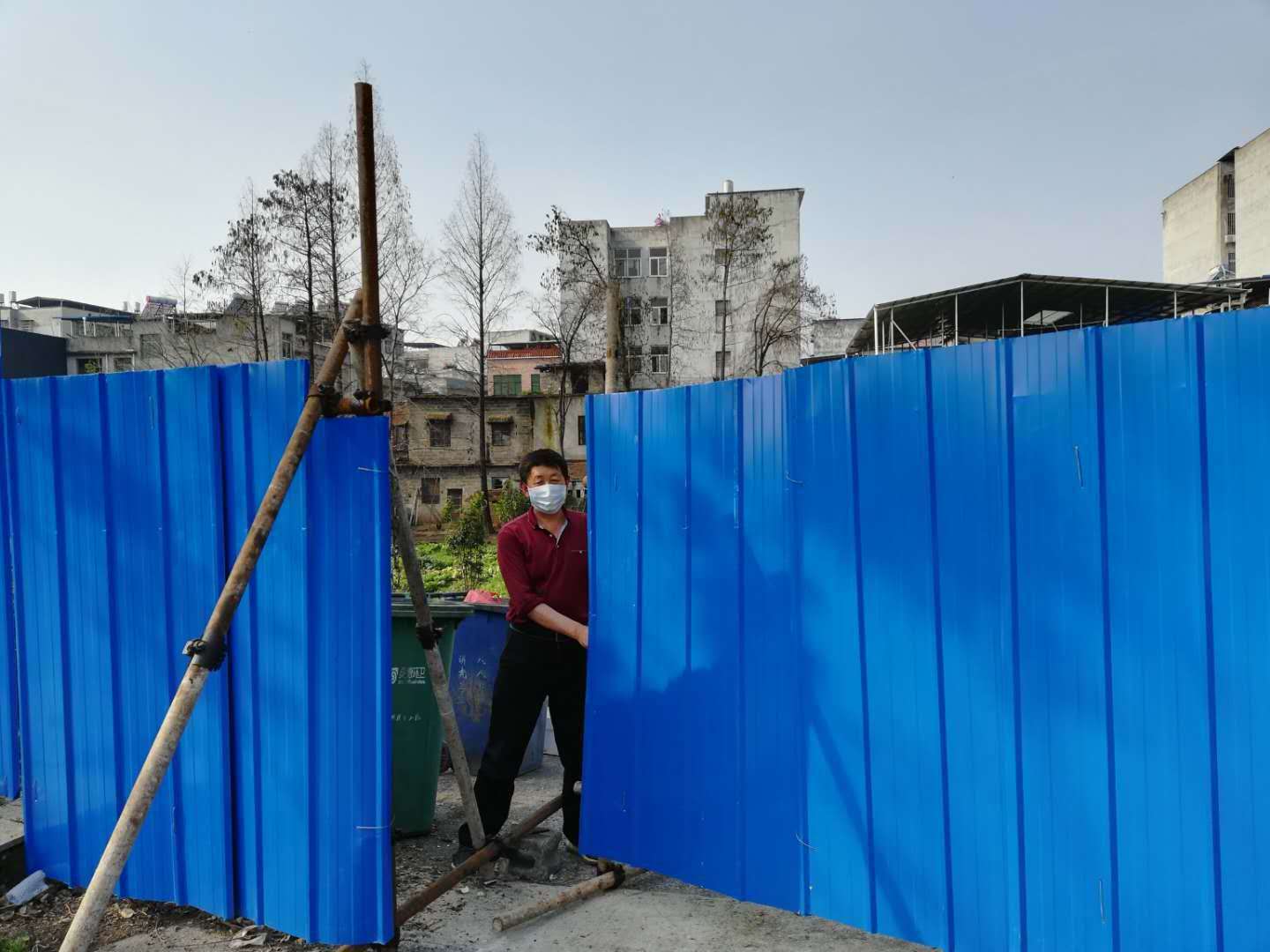 自臘月二十九日開始,村干部們帶頭上,購買了樹木、鐵皮,立樹樁,釘鐵皮墻。大道兩邊相向設(shè)置,從南門河四橋開始,一直到城內(nèi)小區(qū)。到大年三十晚上,兩道藍(lán)色的“屏障”悄悄立起,它們“環(huán)著村、環(huán)著城”,成為斬?cái)嘁吣У摹爸旅徽小薄?/p>