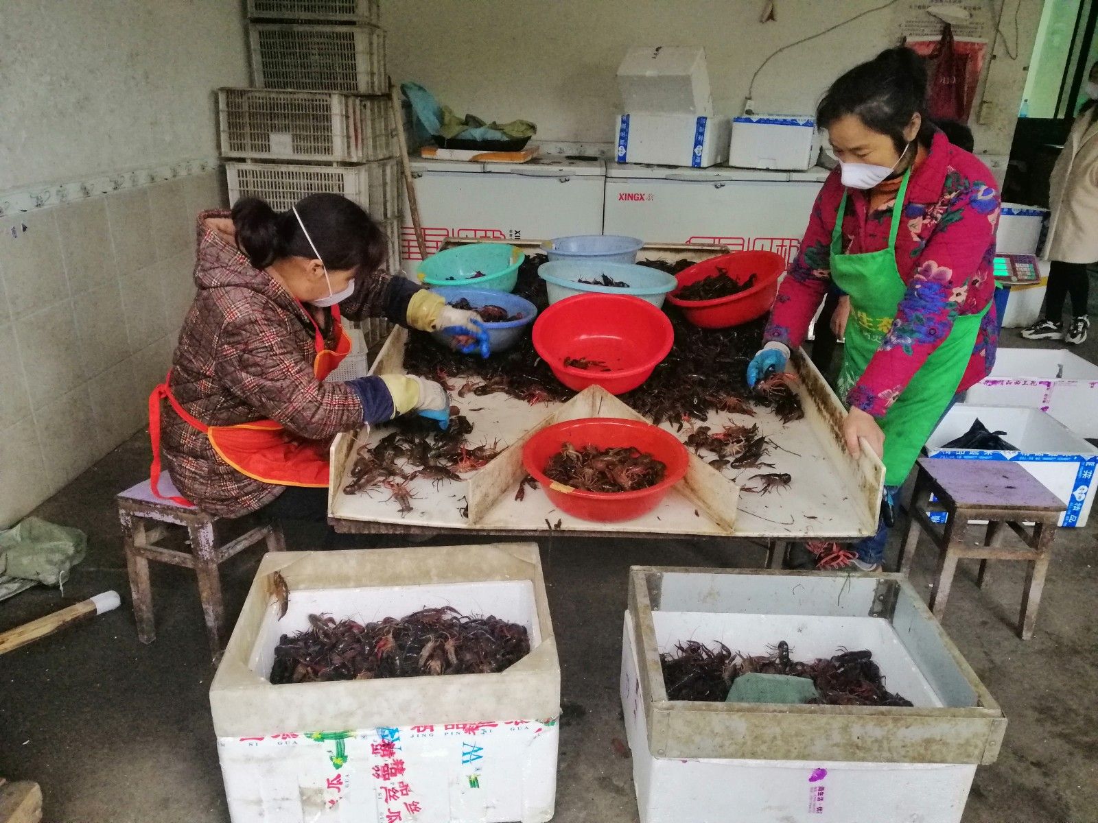 “赤壁小龍蝦品質(zhì)好,個體肥大,肉質(zhì)鮮嫩,一直深受全國各地食客們青睞?!绷璩?點,在車埠鎮(zhèn)芙蓉村小龍蝦交易市場,來自湖南的收購商徐濤就已經(jīng)擺開陣勢,準備收購來自車埠鎮(zhèn)周邊龍蝦養(yǎng)殖戶們的龍蝦。徐濤來赤壁收購龍蝦已經(jīng)三四年了,多的時候每天可以收6000到7000斤。