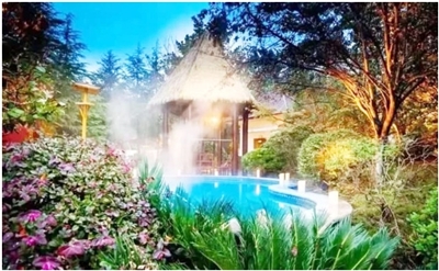 碧桂園的泉眼從上至下流,40多種湯池依據(jù)地勢(shì)高低而建。有一處名為“桂花湯”的泡池,泡池內(nèi)不僅添加了桂花的香料和養(yǎng)顏保膚的秘方,池子底部還散出金黃色的光束,隨起伏的水波搖晃,深得考察團(tuán)女性的喜愛。