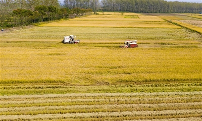 13日,嘉魚(yú)簰洲灣田野一片金黃,40000多畝晚稻田里,幾十臺(tái)收割機(jī)、運(yùn)輸車一片忙碌。