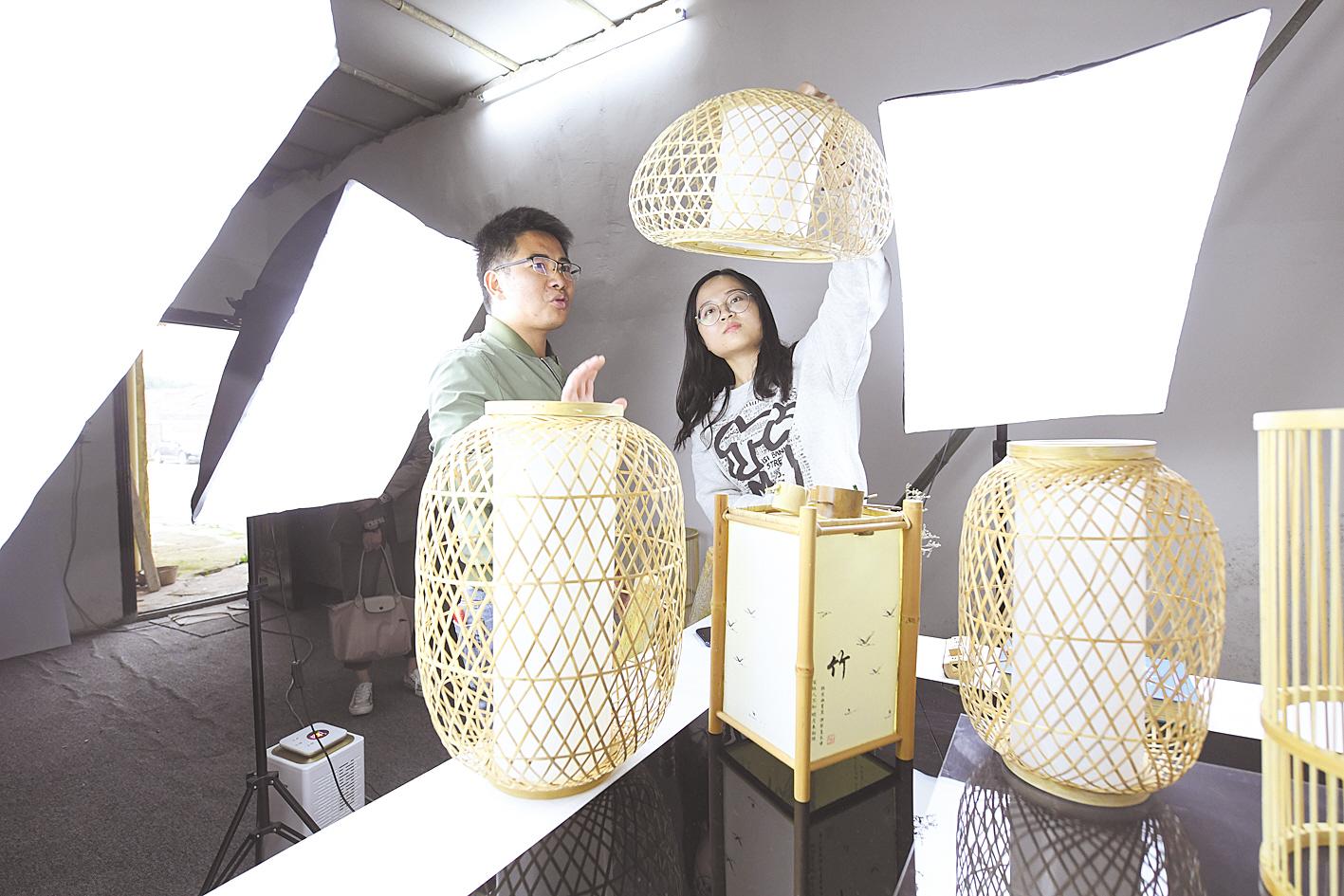 10月14日,咸寧市咸安區(qū)大幕鄉(xiāng)雙垅村竹雕藝人在攝影棚向客人介紹竹制家居用品和工藝品。去年5月,當(dāng)?shù)卮髮W(xué)畢業(yè)生賀慈回鄉(xiāng)創(chuàng)業(yè),成立藝竹情工藝品公司,聘請(qǐng)民間藝人手工制作工藝品,通過(guò)電商銷(xiāo)售,今年前三季度銷(xiāo)售額500多萬(wàn)元。