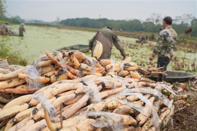 10月26日,嘉魚縣陸溪鎮(zhèn)界石村鴨兒湖養(yǎng)殖專業(yè)合作社里,負(fù)責(zé)人龔木前正和工人們一起忙著挖藕、稱重、清洗、包裝。龔木前是一名退役軍人,2009年,龔木前從部隊(duì)轉(zhuǎn)業(yè)后回鄉(xiāng)創(chuàng)業(yè),承包了村里50畝荒湖種野藕。經(jīng)過幾年時(shí)間的發(fā)展,他成立了農(nóng)業(yè)合作社,把藕塘面積擴(kuò)大到300多畝。近些年,通過他的努力,他家的野藕通過電商遠(yuǎn)銷全國各地,高峰期時(shí),每天可以接到200余張訂單。 通訊員 耿海軍 杜瑞 攝