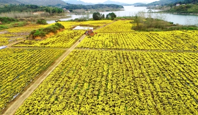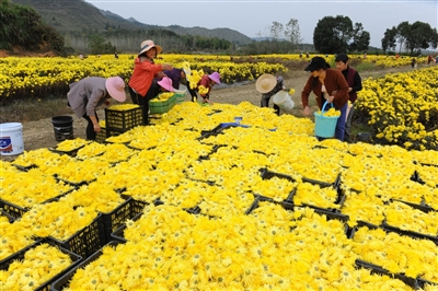 11月4日,通山縣燕廈鄉(xiāng)湖畔村皇菊種植基地,金絲皇菊怒放,猶如一張金色地毯舒展在田野上,村民穿梭在花叢中采收菊花。燕廈鄉(xiāng)湖畔村是典型的庫(kù)區(qū)貧困村,近年來(lái),市公共檢驗(yàn)檢測(cè)中心駐村工作隊(duì)和燕廈鄉(xiāng)黨委政府結(jié)合湖畔村地理環(huán)境,成立村集體合作社,打造60畝金絲皇菊種植基地,延伸菊花深加工產(chǎn)業(yè)鏈,通過與貧困戶采取“勞務(wù)聯(lián)結(jié)機(jī)制”簽署合同協(xié)議,讓村民實(shí)現(xiàn)家門口就業(yè)。