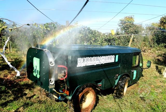 “一輛植保車輕輕松松一小時噴灑作業(yè)可以達到25畝以上,這是人工一天‘拉了瓦’也到達不了的的作業(yè)量?!?1月12日,在神山興農(nóng)公司位于官塘驛鎮(zhèn)御屏山村的半島獼猴桃基地,熊堃坐進1.5米身高的袖珍新能源植保車,拉動手閘,轉(zhuǎn)動方向盤,一番操作后,通過7條噴孔噴出的霧狀藥液在陽光下形成一道彩虹。