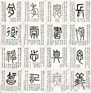 在創(chuàng)作中,陳履生用接近現(xiàn)代繪畫的方式,將字的主體以篆書寫在中心位置,周圍以行書題跋書寫注釋、個人感悟等相關(guān)內(nèi)容,強化對這個字的認識過程,讓人有更深刻的理解。如開篇第二字“義”字的題跋,除了引用古籍中對義字的解讀,還加入了一句“時在國家多事之時,義士善舉皆多”的感悟,與當(dāng)時“大疫當(dāng)前有大義”的情境十分貼合。