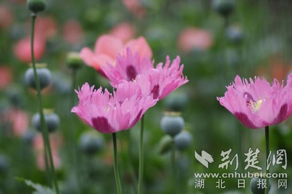 在罌粟屬的植物中,還有個常見的觀賞花卉虞美人,因為兩者花期一致,外形相似,常常被公眾混淆。在罌粟籠子的周圍,武漢植物園還種植了上白株罌粟的“姐妹花”虞美人,方便市民對比鑒別。