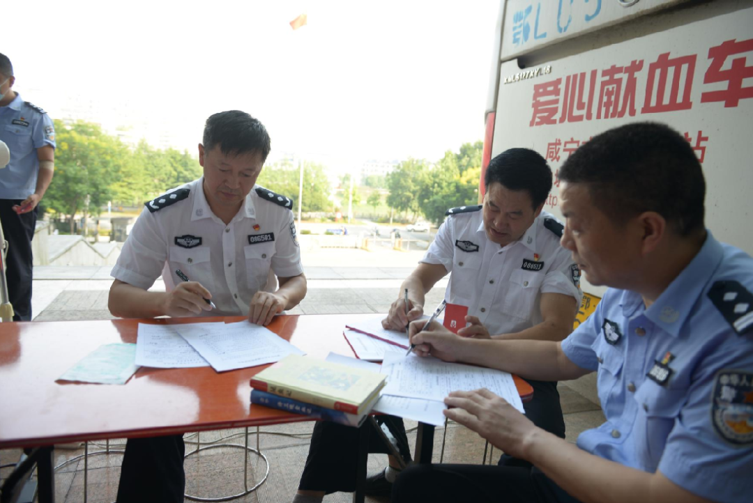 在咸寧公安主樓門廊中,聞?dòng)嵹s來的民輔警整齊列隊(duì),按照醫(yī)務(wù)人員的指引,依次進(jìn)行信息登記、血液檢查、靜脈采血。有多次參加獻(xiàn)血的“金獎(jiǎng)老將”,也有初次上陣的“警營新兵”,還有尚在見習(xí)期的“學(xué)警新秀”。心照不宣的接力,在新老交織中流淌、賡續(xù)、傳承,匯聚起愛的暖流!
