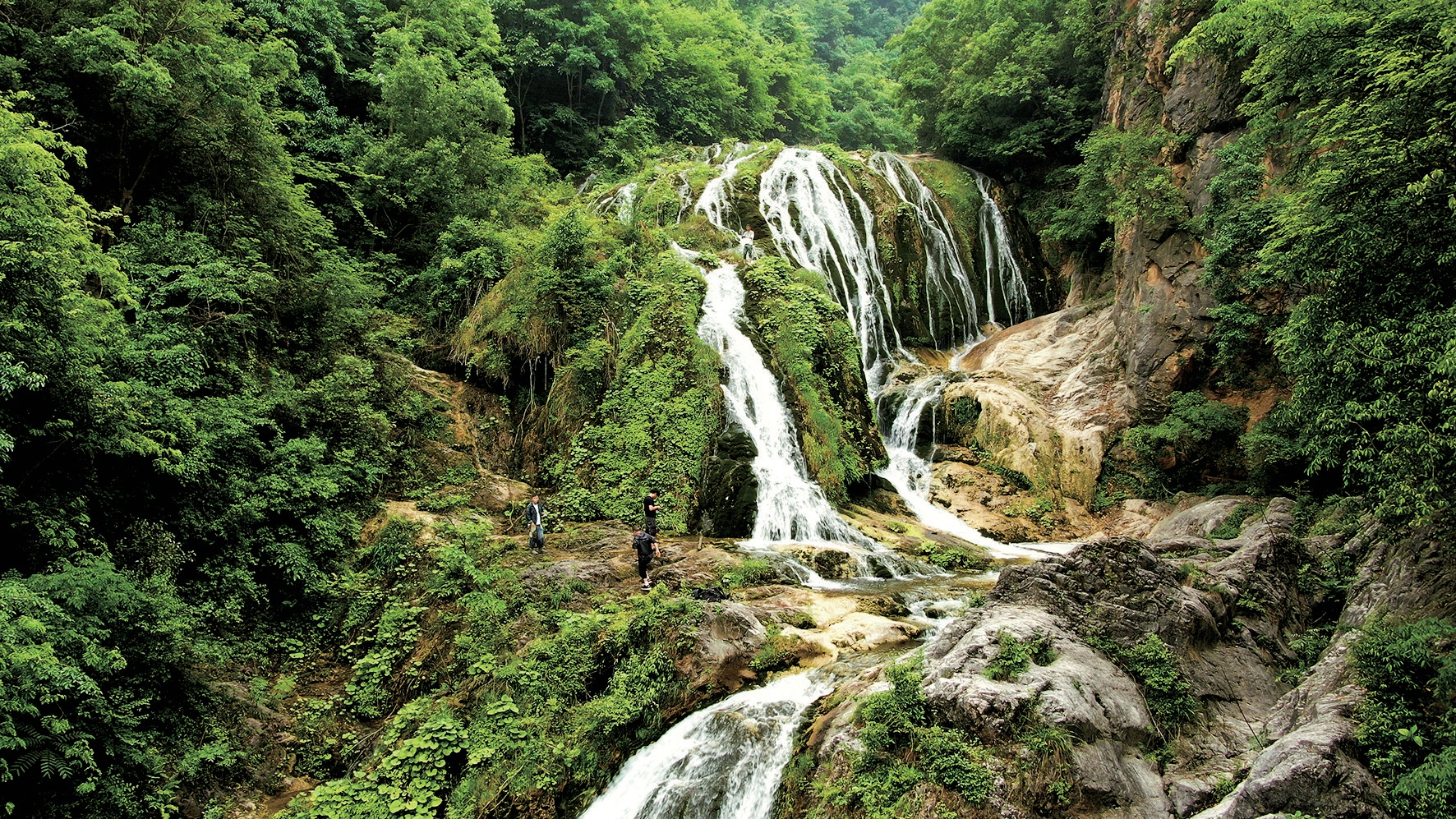 順著溪流下行半個(gè)多小時(shí),一條十幾米寬的激流被陡峭山崖阻擋后形成無(wú)數(shù)分支,從約20米高的大型鈣化梯坎上跌落。這是該河段最為壯觀的一處瀑布,氣勢(shì)磅礴,聲聞十里,如戰(zhàn)鼓擂動(dòng)、萬(wàn)馬奔騰。