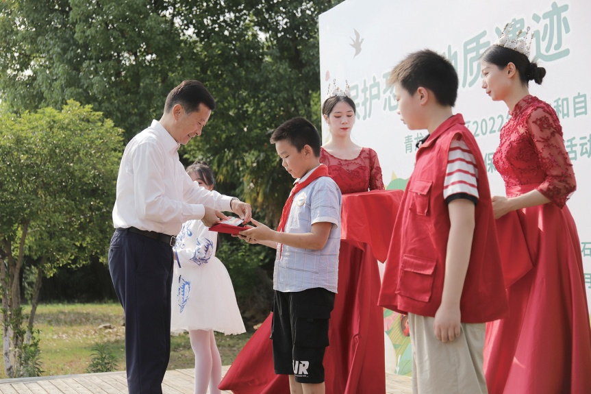 湖北青龍山恐龍蛋化石群國(guó)家級(jí)自然保護(hù)區(qū)管理局局長(zhǎng)、黨組書記姚天國(guó)為獲獎(jiǎng)學(xué)生頒獎(jiǎng)。