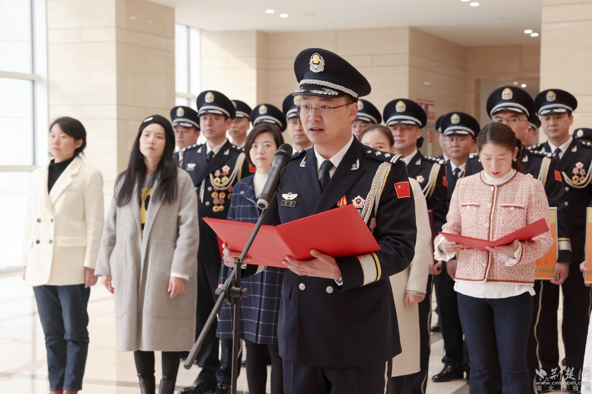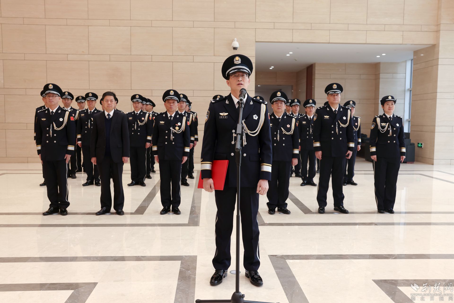 飄揚的警旗下,黃石市副市長、市公安局黨委書記、局長黃志勇帶領(lǐng)大家重溫入警誓詞:“我是中國人民警察,我宣誓……”全體民警高舉右臂,緊握右拳,鏗鏘有力的話語表達(dá)對公安事業(yè)的無限熱愛。