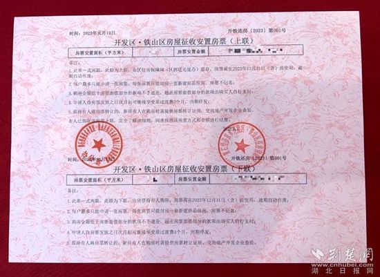 “這是我區(qū)年初推出試行房票安置制度后發(fā)放的首張房票,也是全市首張房票?!遍_發(fā)區(qū)·鐵山區(qū)住房保障局開發(fā)科科員王哲介紹,通過房票安置方式,一方面縮短了拆遷群眾安置時(shí)間,另一方面拓寬了安置房源,打通住房轉(zhuǎn)換通道后,拆遷群眾可以根據(jù)個(gè)人需求購買心儀的商品房用來安置,選擇范圍更大了、居住環(huán)境更好了、生活品質(zhì)更高了。